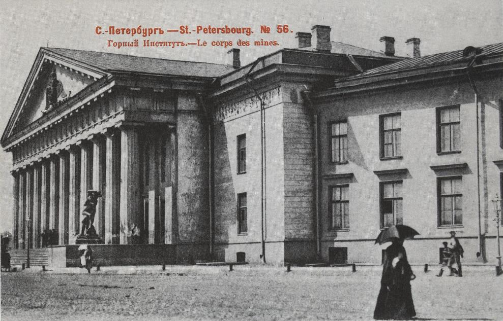 В 1806 - 1811 годах на набережной Невы по проекту архитектора Андрея Никифоровича Воронихина было воздвигнуто знаменитое здание института - признанный шедевр классического стиля. Фасад был украшен рельефным фризом работы Василия Ивановича Демут-Малиновского - "Венера приходит к Вулкану за доспехами Марса" и "Аполлон-Мусагет забирает в мастерской Вулкана свою золотую колесницу". Как видим, оба сюжета посвящены античному богу огня Вулкану (в греческой мифологии - Гефесту), покровителю ремесленников, искусному мастеру, получавшему заказы даже от своих единокровных братьев и сестёр с Олимпа. О богатствах Земли - основном предмете изучения в Горном институте - косвенно напоминают и установленные перед портиком фасада скульптурные группы: "Бог подземного царства Плутон похищает юную Прозерпину" и "Поединок Геракла с сыном Земли Антеем" (авторы, соответственно, Василий Иванович Демут-Малиновский и Степан Степанооич Пименов).