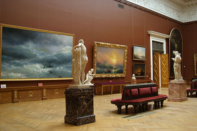 Среди всемирно известных шедевров, которыми заслуженно гордятся Русский музей, Санкт-Петербург и петербуржцы, перечислим портреты воспитанниц Смольного института Д.Г.Левицкого; картины "Последний день Помпеи" К.П.Брюллова, "Сватовство майора" П.А.Федотова, "Бурлаки на Волге" и "Запорожцы" И.Е.Репина, "Покорение Сибири Ермаком" и "Переход Суворова через Альпы" В.И.Сурикова, "Лунная ночь на Днепре" А.И.Куинджи, "Витязь на распутье" В.М.Васнецова; портреты работы И.Н.Крамского, пейзажи работы И.И.Шишкина, Ф.А.Васильева и И.И.Левитана и многие другие.