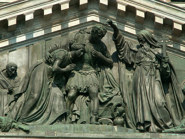 Всемирно известный петербургский храм освящён в честь проживавшего в IV веке нашей эры в Далмации, то есть на территории нынешних Черногории и Хорватии, христианского монаха Исаакия Далматского. Именно он предсказал древнеримскому императору Валенту, упорно не желавшему принимать христианство, поражение и гибель в войне с готами; 9 августа 378 года Валент погиб в битве под Адрианополем (северо-западная Турция; по легенде, Валент был сожжён живьём в стоге сена, в котором спрятался после разгрома его войск).