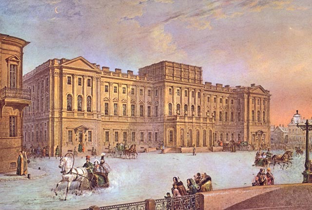 В 1762 - 1768 годах на набережной Мойки был возведён по проекту Жана-Батиста-Мишеля Валлен-Деламота (1729 - 1800) дворец для графа Ивана Григорьевича Чернышева (1717 - 1797), выдающегося государственного деятеля времён Екатерины II и Павла I, генерал-фельдмаршала, президента Адмиралтейств-коллегии. В 1825 году в бывший дворец Чернышева въехала Школа гвардейских подпрапорщиков и кавалерийских юнкеров, которую в 1834 году окончил Михаил Юрьевич Лермонтов.
