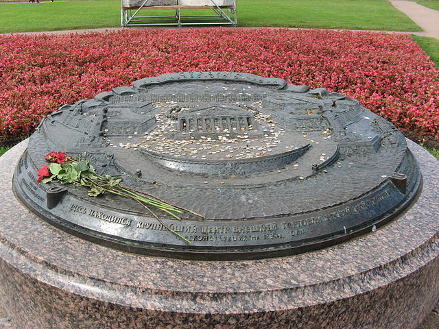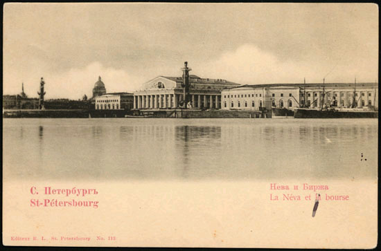 Образцы товаров были представлены в Бирже (1805 - 1810, архитектор Жан-Франсуа Тома де Томон). По его же проекту были сооружены и Ростральные колонны - портовые маяки (по другим мнениям, фонари), украшенные "рострами" - копиями носов античных кораблей, отрубавшихся в Древнем Риме победителями и фигурами, изображающими, по легенде, четыре великие реки России - Неву, Волгу, Днепр и Волхов.