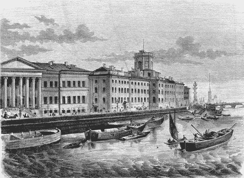 Первоначально Академия наук разместилась в доме сосланного к тому времени за злоупотребления в Нижний Новгород президента Коммерц-коллегии и вице-канцлера Петра Павловича Шафирова на нынешней Петровской набережной Невы (на этом примерно месте в 1932 - 1938 годах был сооружён нынешний № 8 - "Дом Балтфлота"). В 1728 году Академию перевели в здание Кунсткамеры, в башне которой, в зале, где проходили заседания академиков, сегодня работает Музей Михаила Васильевича Ломоносова, и в расположенный рядом дворец царицы Прасковьи Фёдоровны (вдовы царя Ивана V), на месте которого сейчас находится здание Зоологического музея. Наконец, при Екатерине II, в 1783 - 1784 годах на набережной Невы было построено новое здание Академии по проекту Джакомо Кваренги (1744 - 1817).