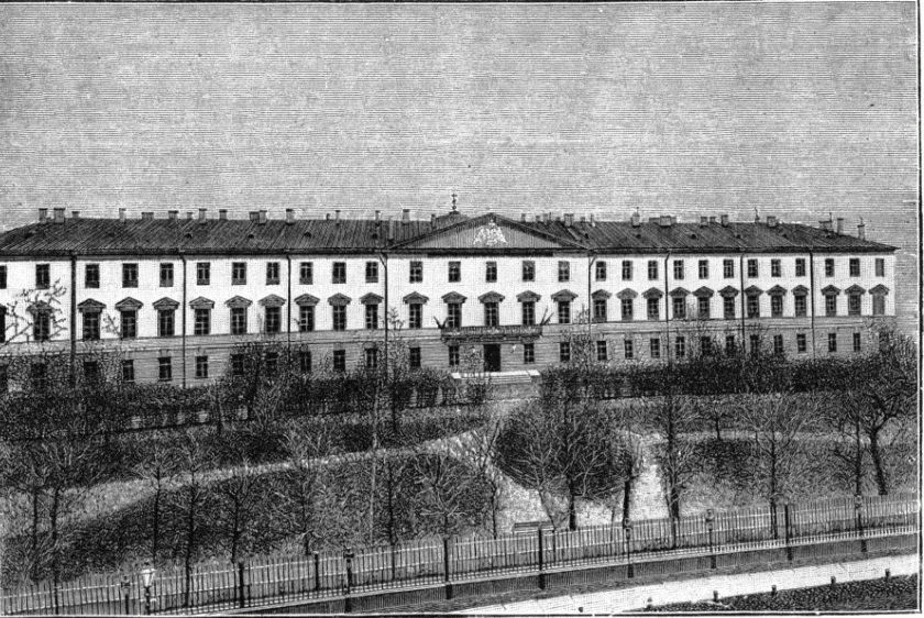 Военное училище было основано указом Александра I 9 мая 1823 года и в 1825 году въехала в бывший дворец Чернышева на Исаакиевской площади. В 1839 году, с началом строительства Мариинского дворца, в западное крыло которого был включён Чернышевский дворец, Школа гвардейских подпрапорщиков и кавалерийских юнкеров переехала в специально сооружённое для неё здание на Ново-Петергофском проспекте. В 1859 году училищу было присвоено имя императора Николая I, а в 1864-м за ним окончательно закрепилось название Николаевского кавалерийского.