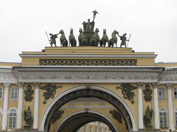 Триумфальная арка, украшенная ведомой шестёркой лошадей и античными воинами колесницей крылатой богини Победы Ники, изображениями доспехов, богинь Славы с лавровыми венками, была торжественно открыта 24 октября 1828 года. Авторы скульптур - Степан Степанович Пименов (1784 - 1833) и Василий Иванович Демут-Малиновский (1779 - 1846); монумент посвящён победам русской армии над войсками Наполеона Первого в 1812 - 1814 годах. Под аркой до сих пор можно увидеть старинные уличные часы с надписью "Главная палата мер и весов на циферблате", установленные по инициативе возглавлявшего Палату Д.И.Менделеева (Дмитрий Иванович пообещал провести электрический кабель от отрегулированных по Пулковскому меридиану часов Палаты, располагавшейся, как известно, на линии меридиана, совпадающей с направлением Забалканского (Московского) проспекта, в Главный штаб при условии выделения ему средств, необходимых для развития учреждения).